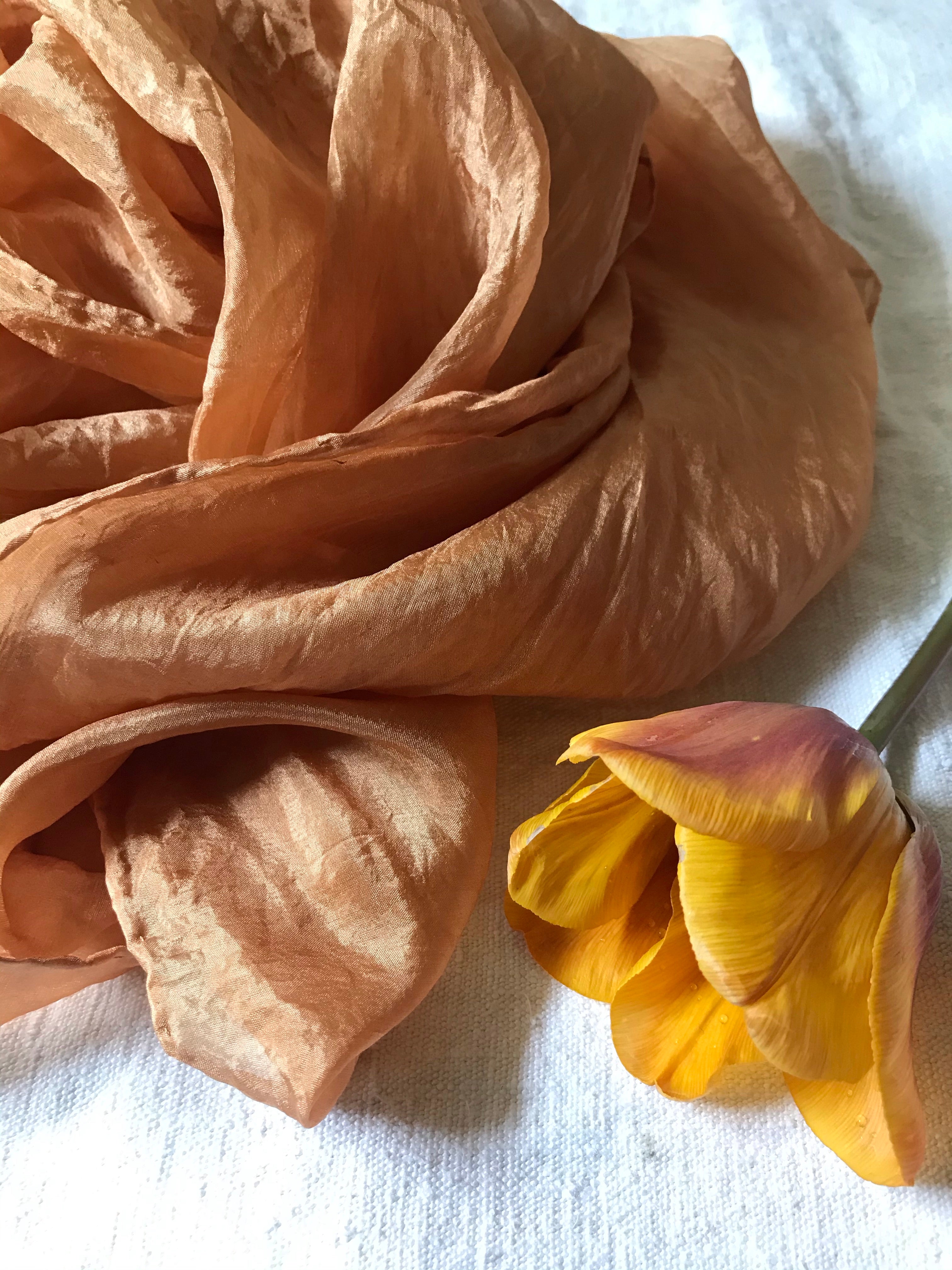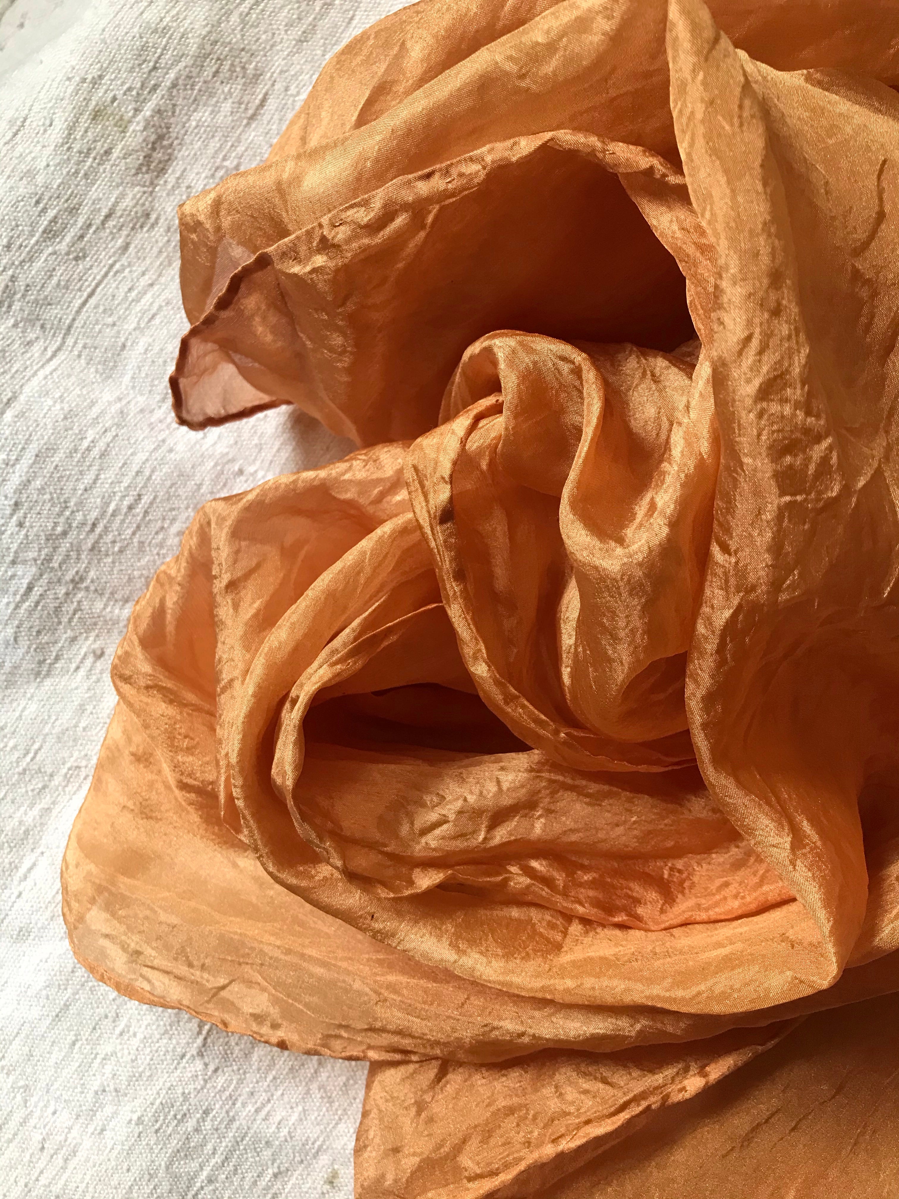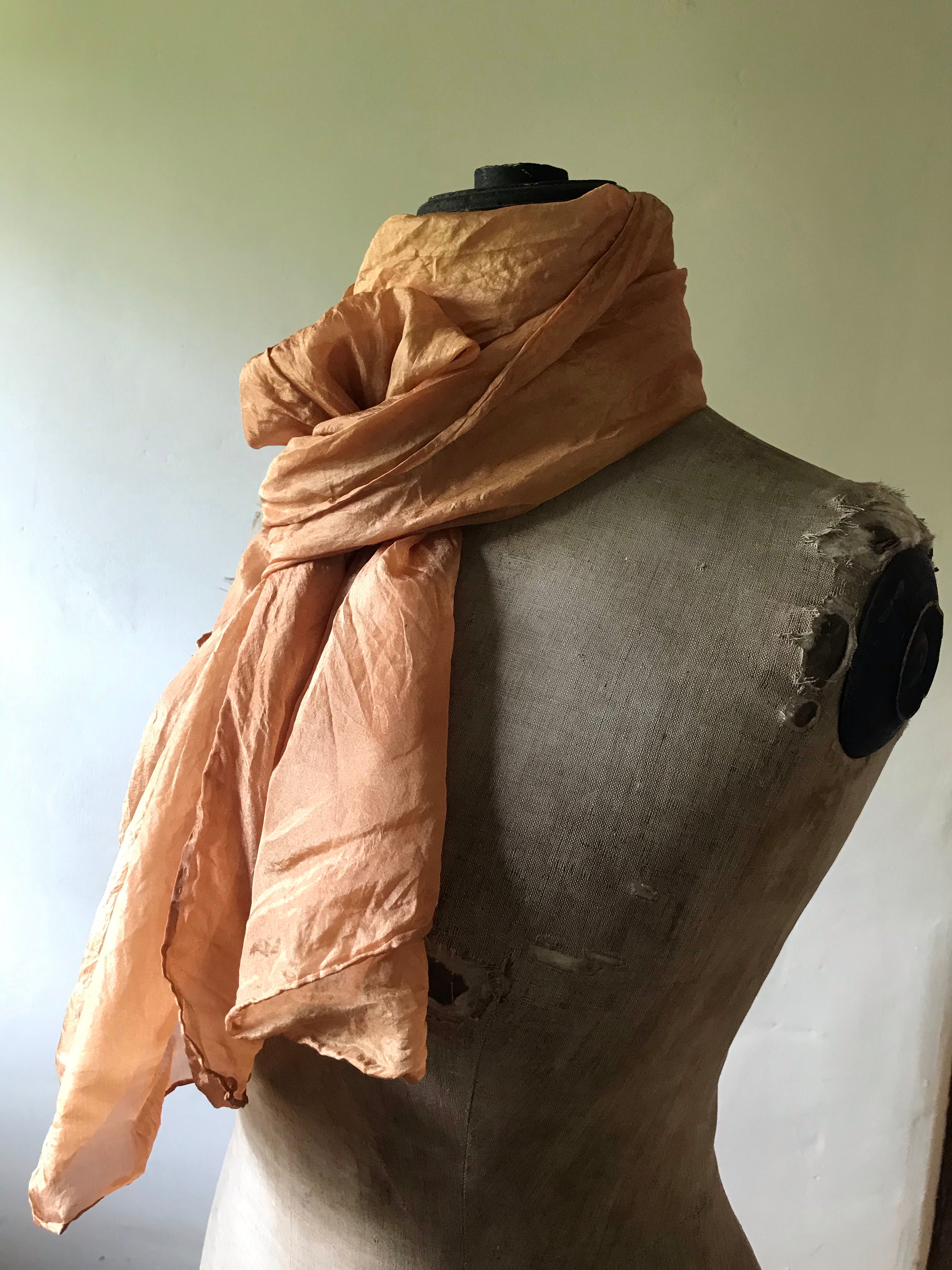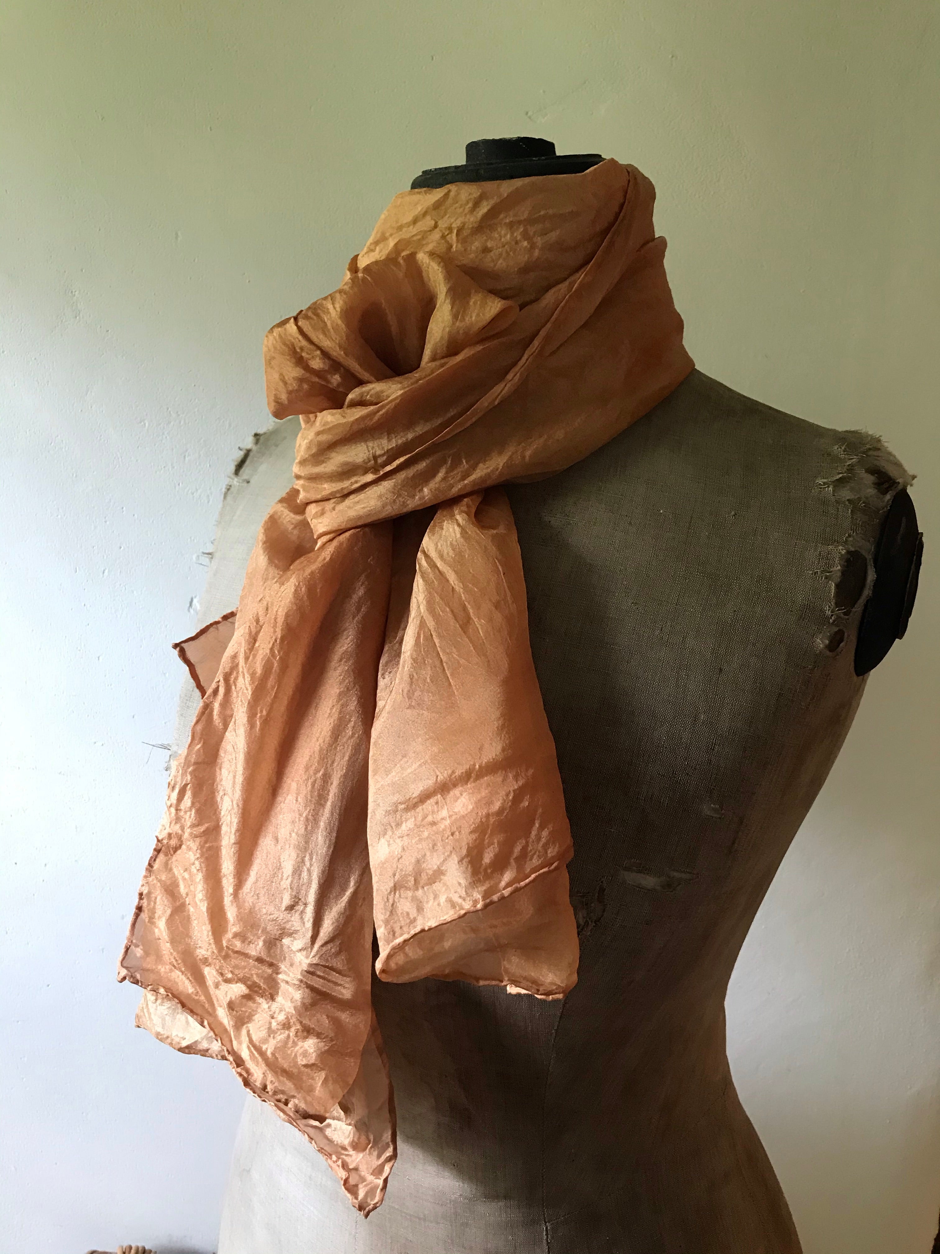 Overview and returns A longline silk scarf in irridescent silk, dyed by hand using 100% natural vegetable dyes. Gorgeously soft and light as air. Hand stitched and rolled edges. A...