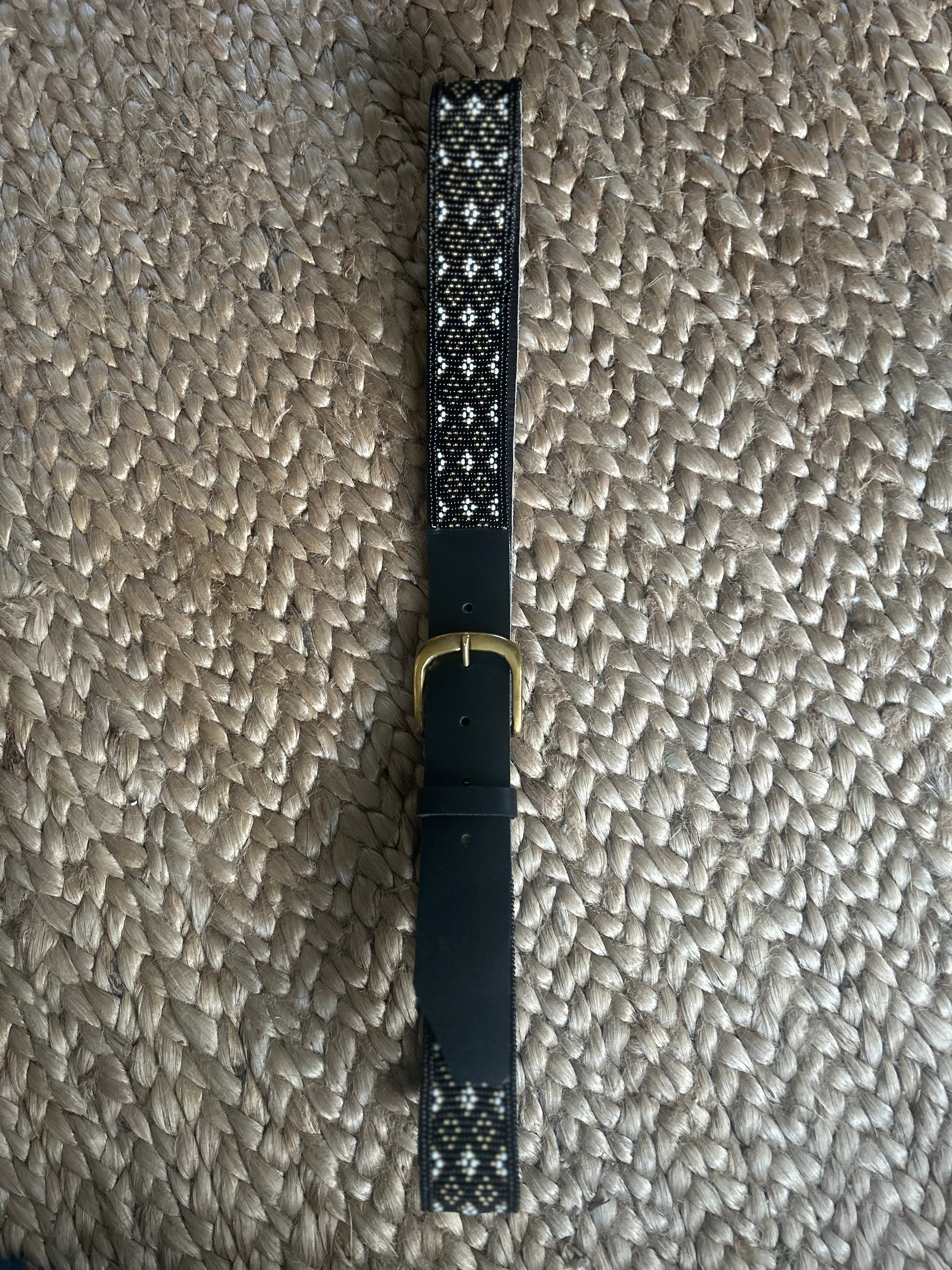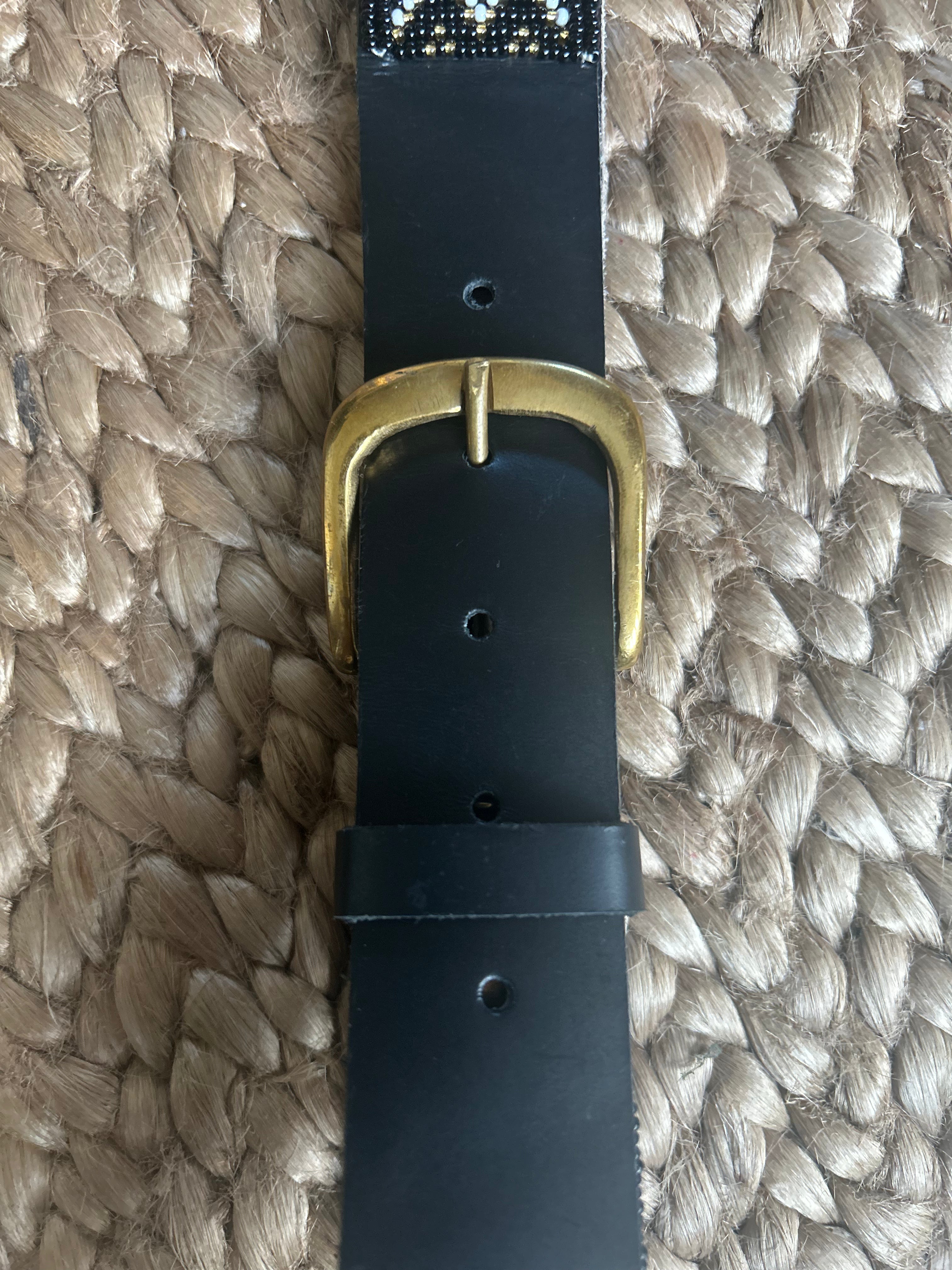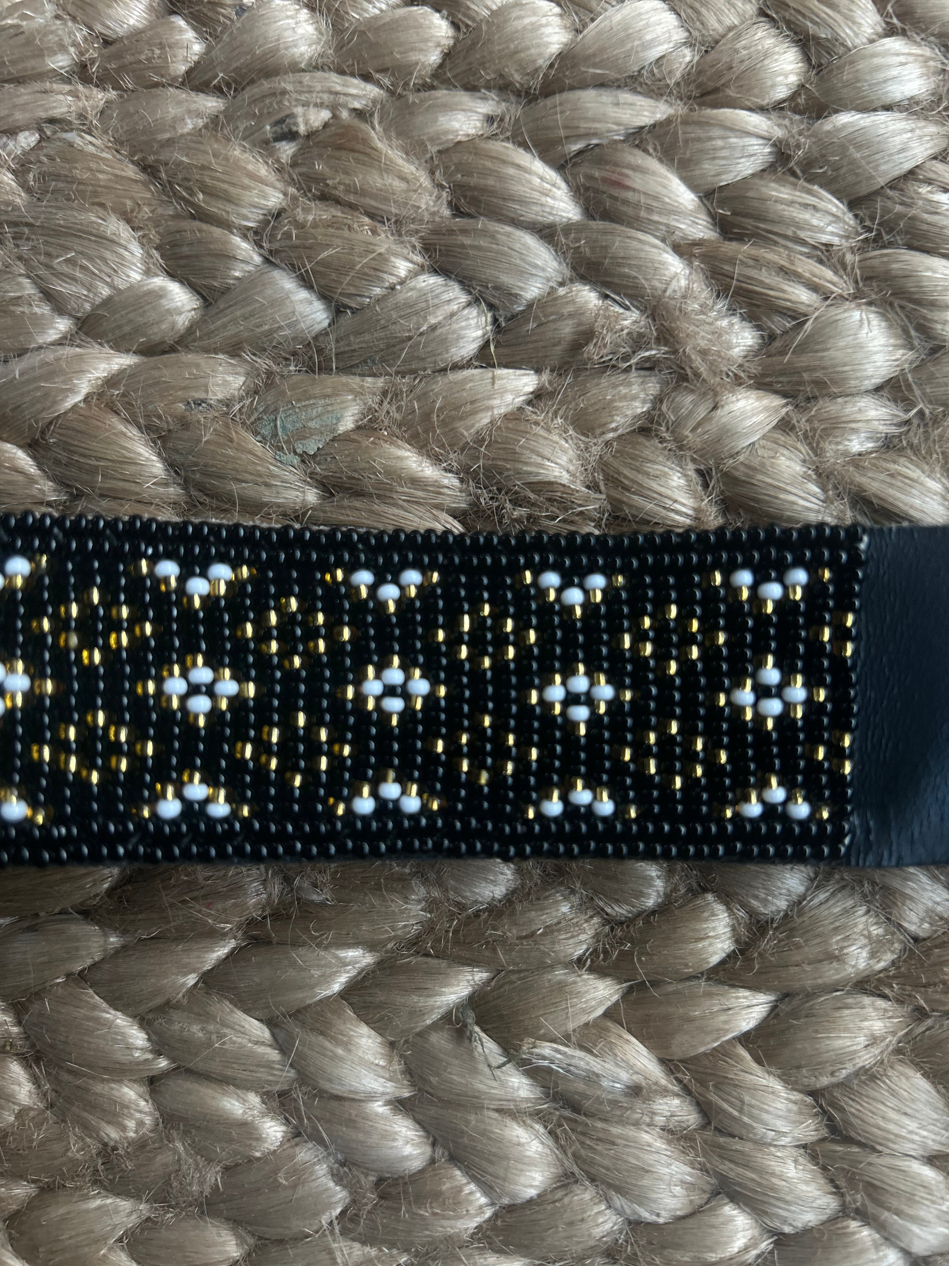• A beautiful beaded belt of brown leather densely embroidered with black beads speckled with black and subtle gold.
