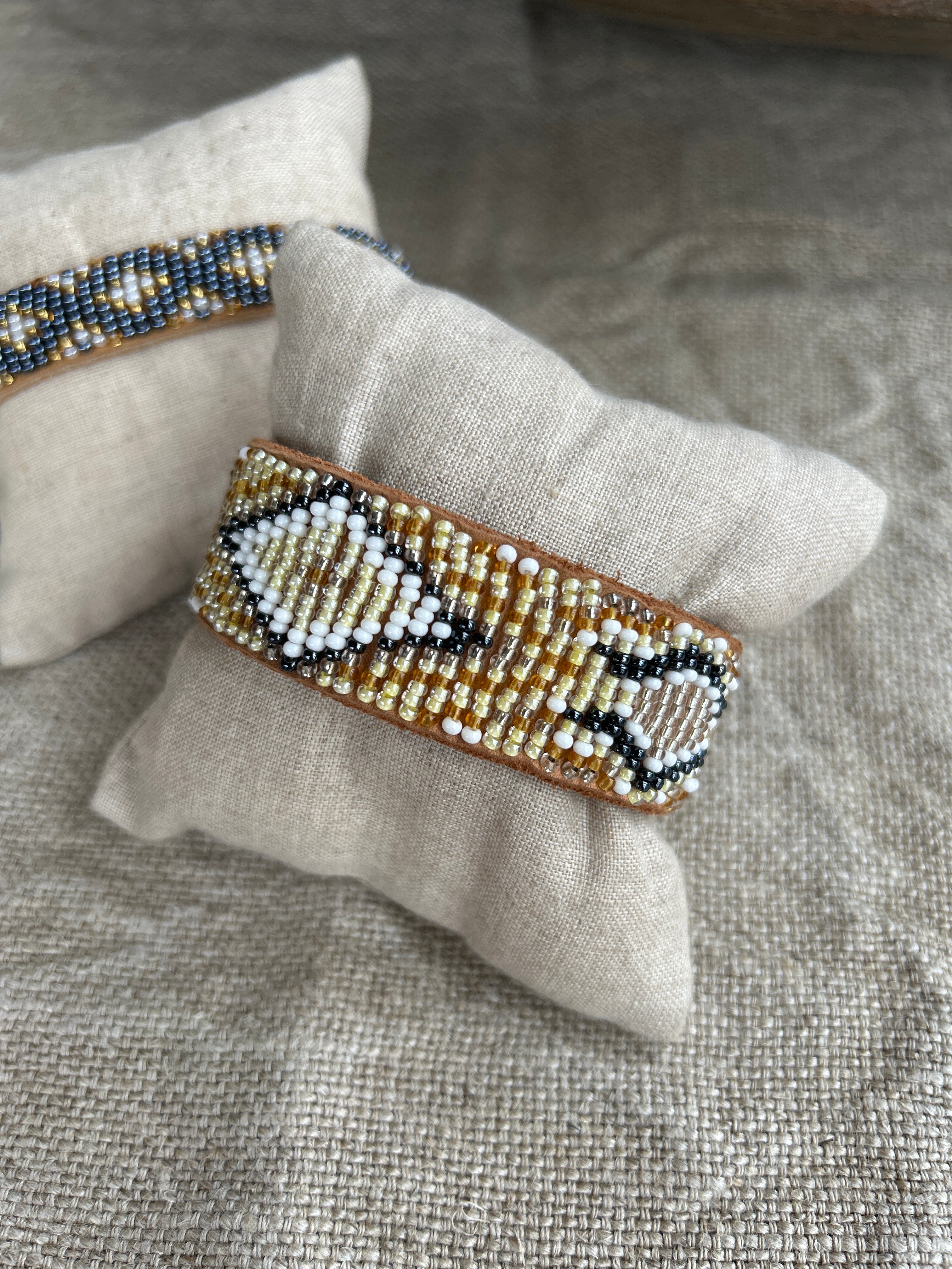 • Intricately and expertly beaded by hand in muted colours of bronze, pearlised grey and silver, the beads are neatly and securely stitched onto soft but durable pale tan leather hide. The cuff is fastened simply by a brass popper.