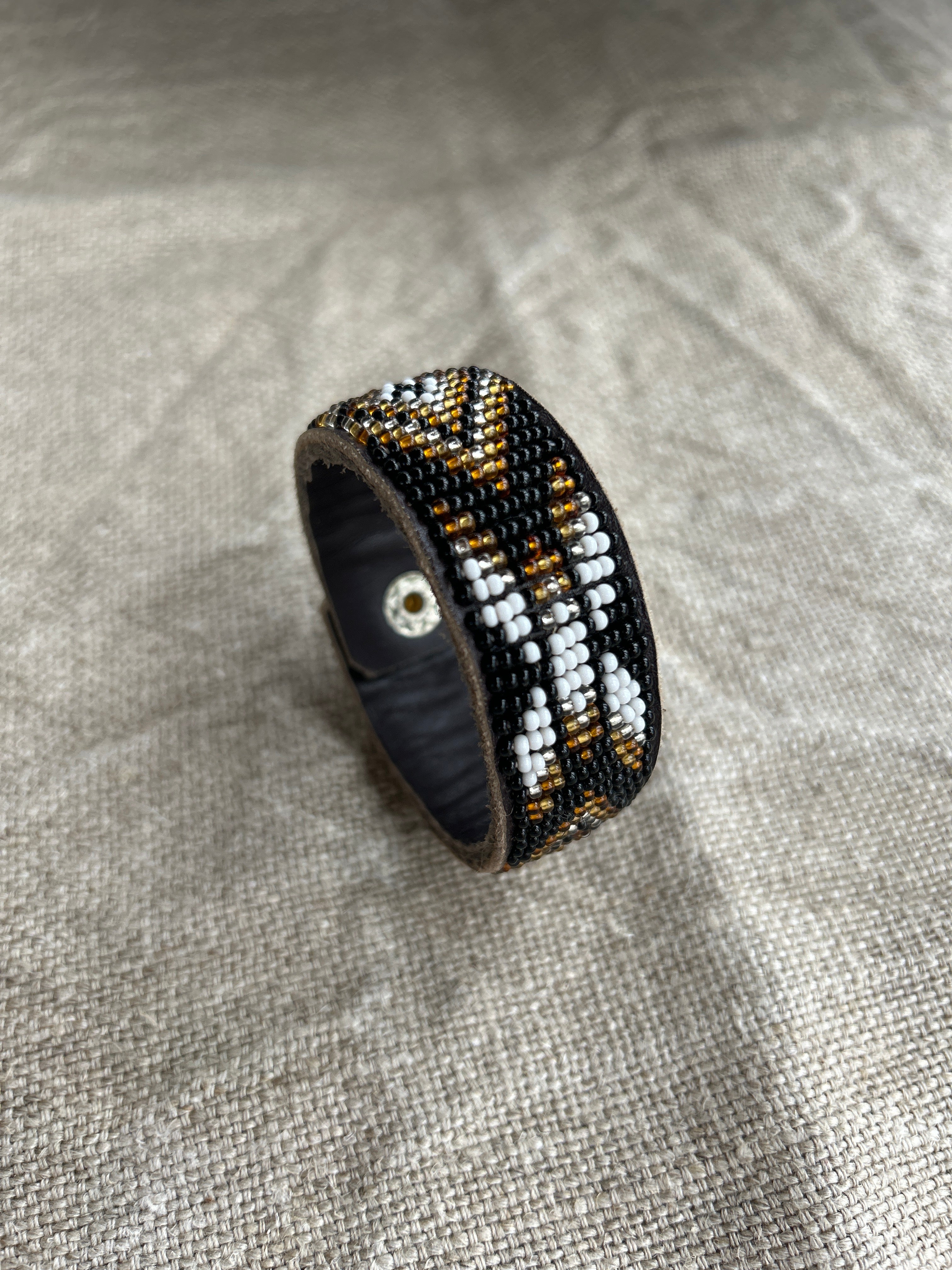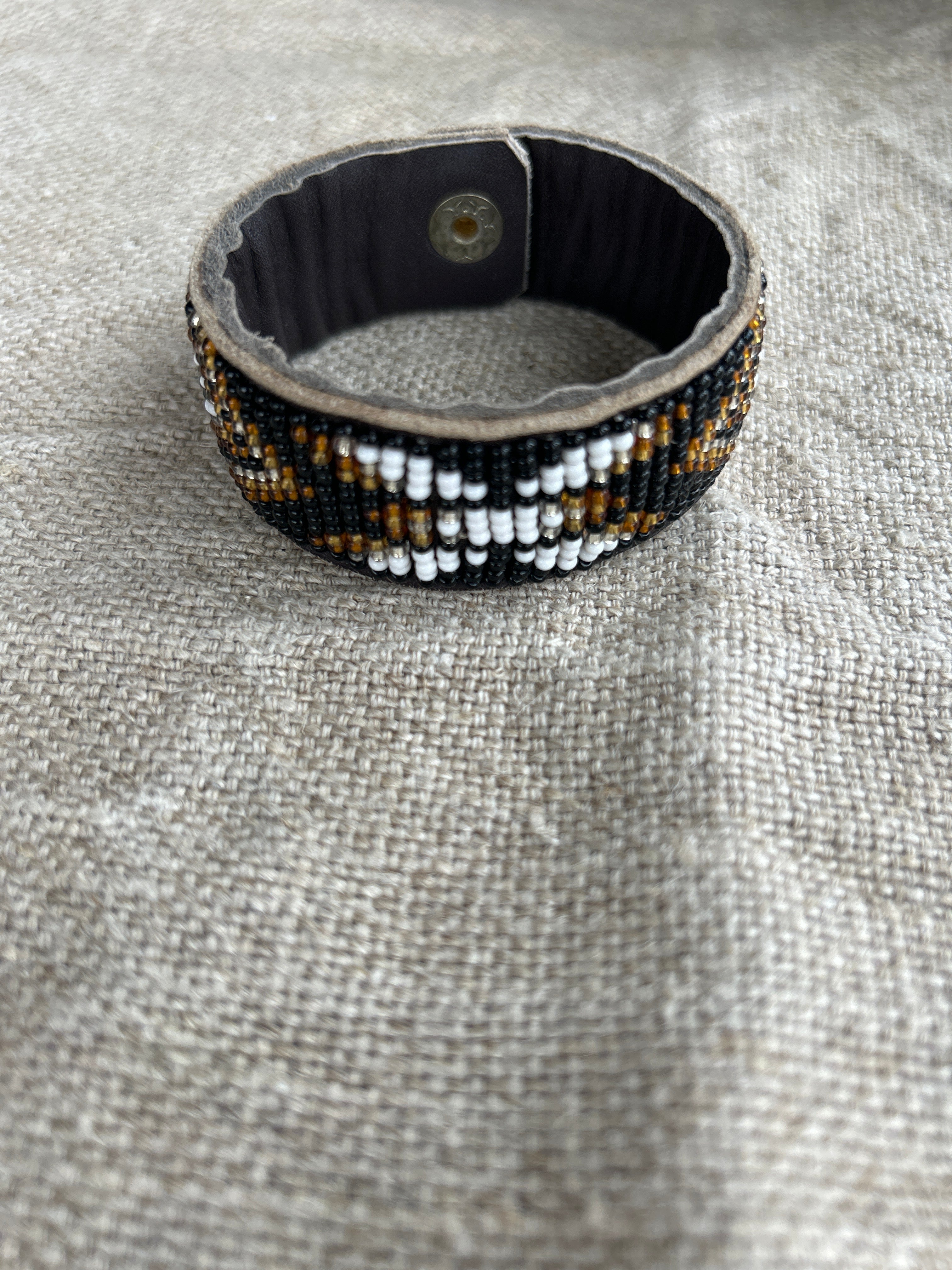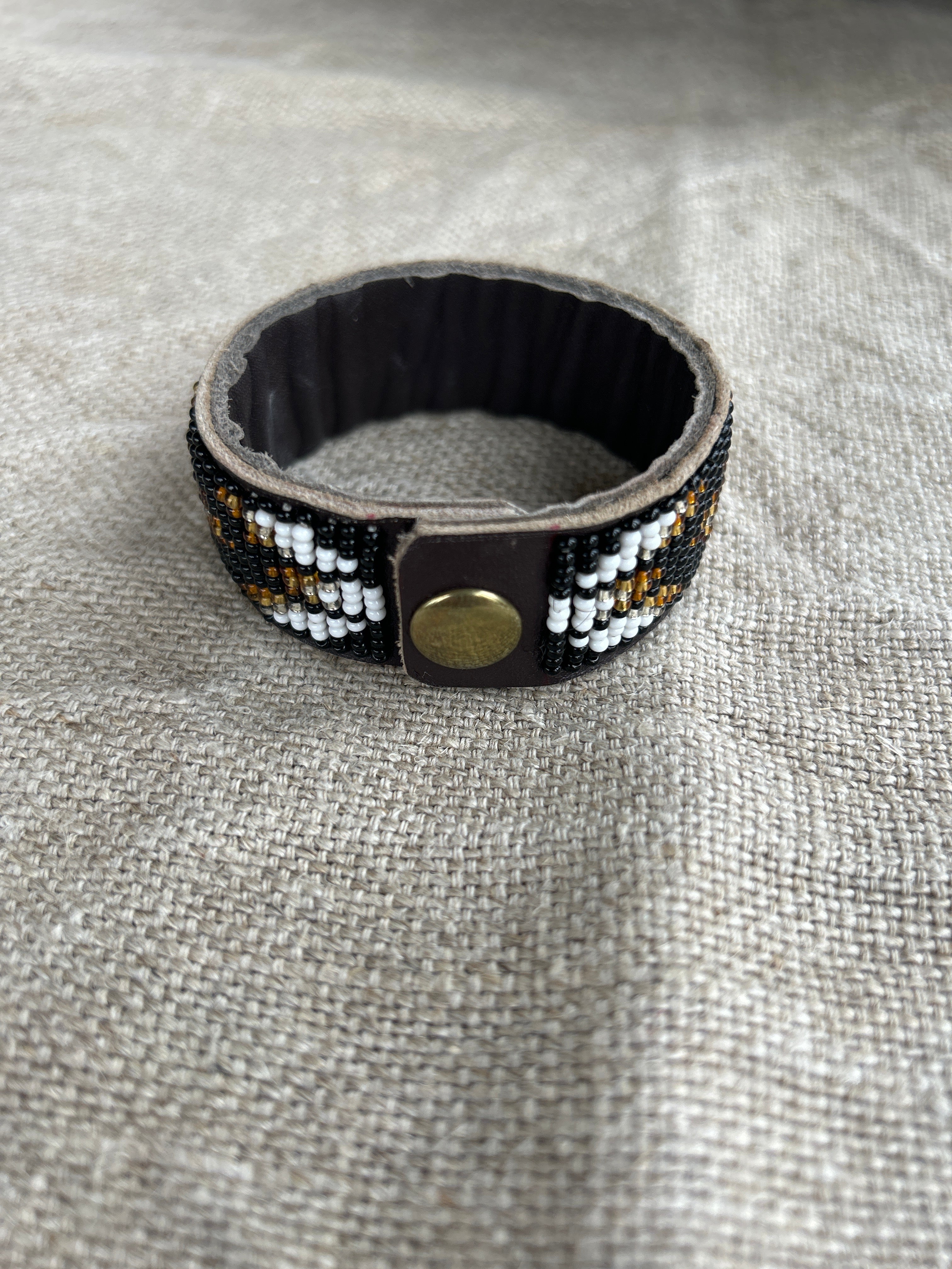 • The beads are neatly and securely stitched onto soft but durable brown leather hide. The cuff is fastened simply by one brass popper.