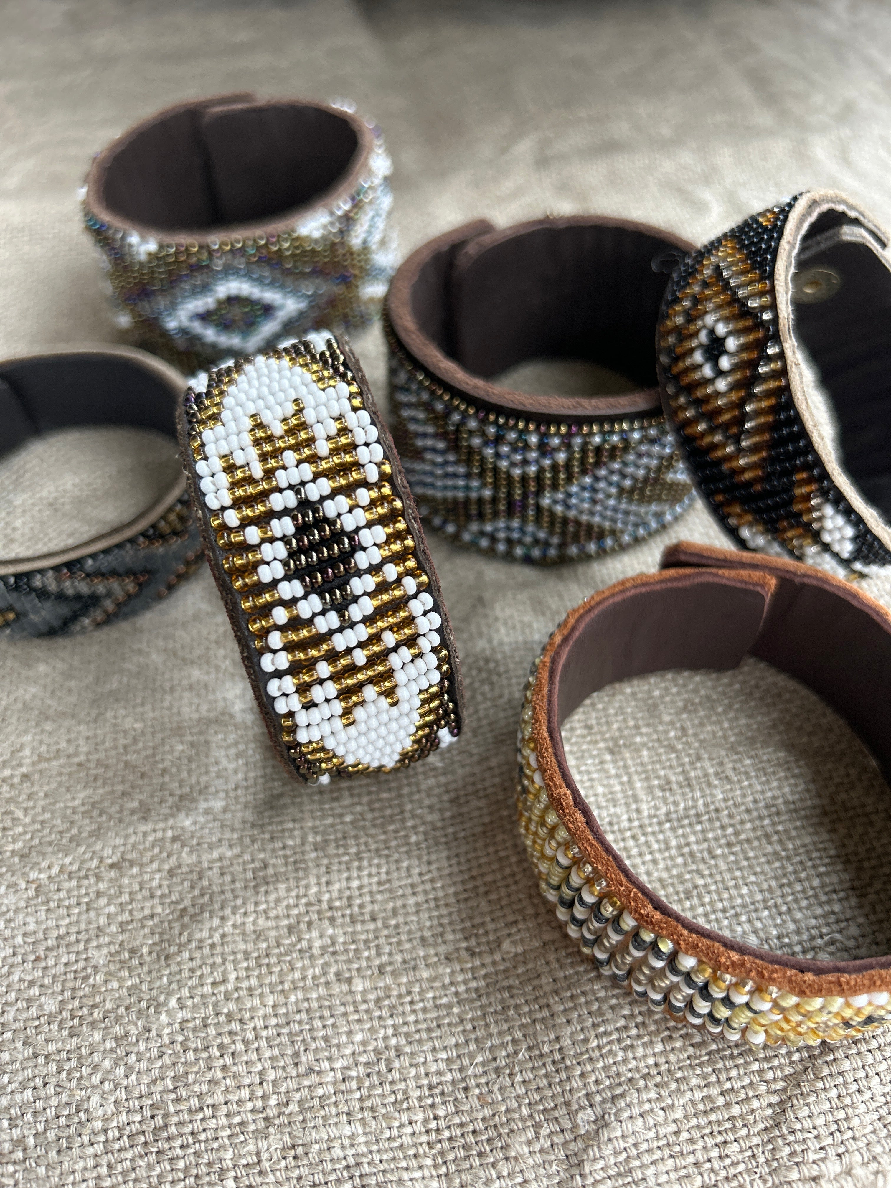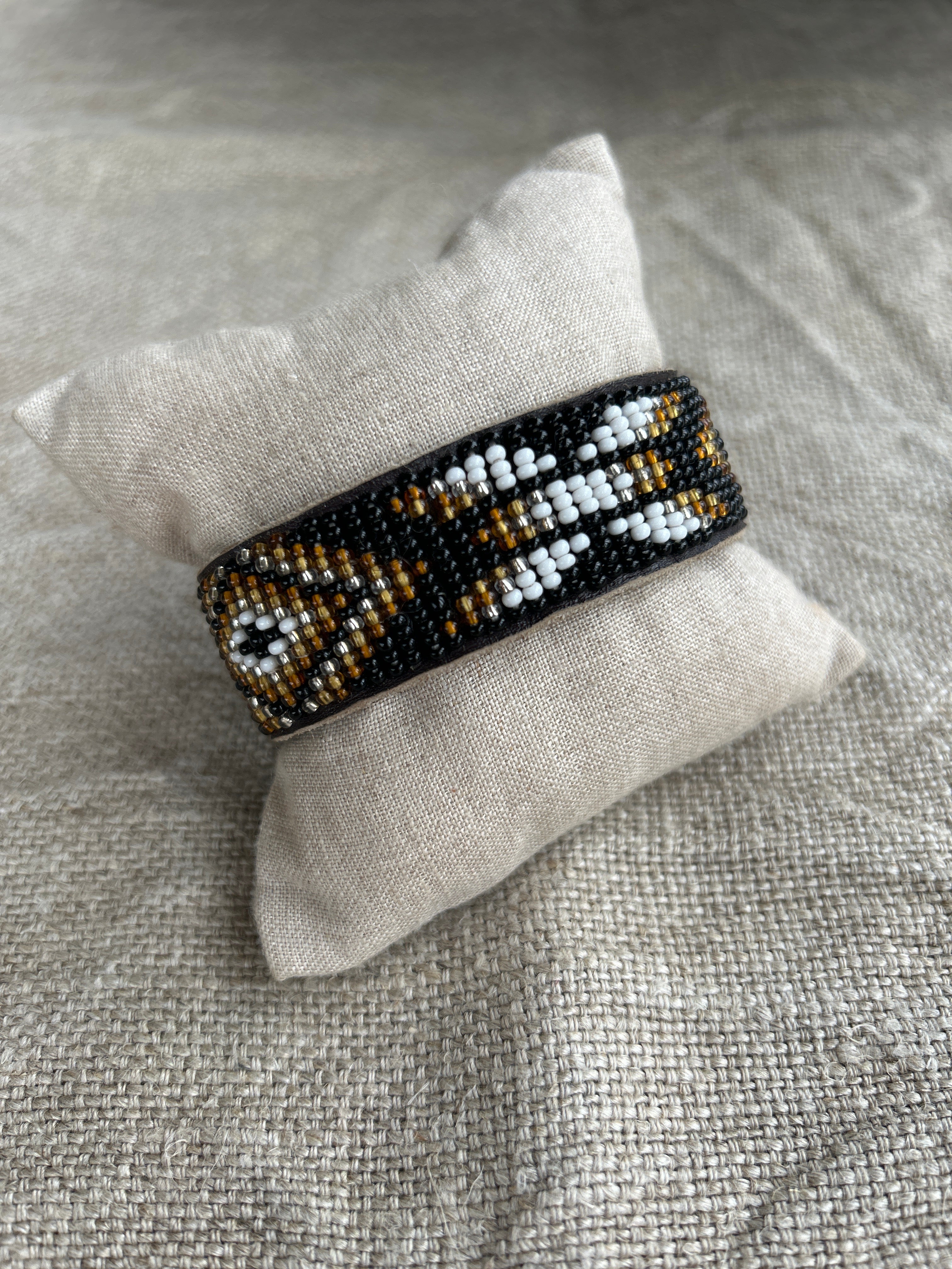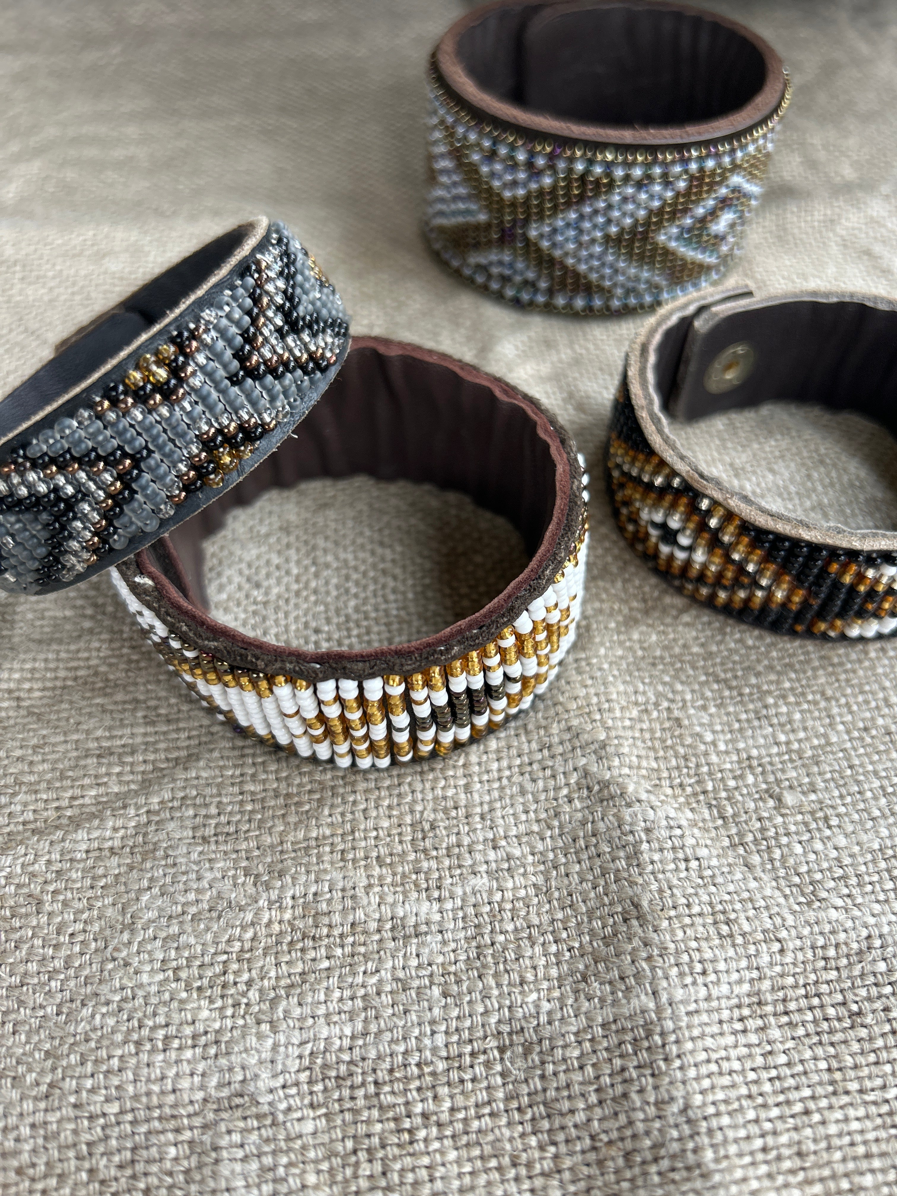 • The beads are neatly and securely stitched onto soft but durable brown leather hide. The cuff is fastened simply by one brass popper.